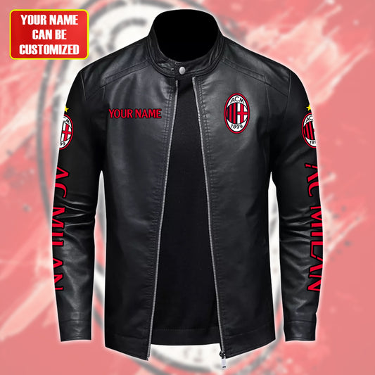 Personalized AC Milan Leather Bomber Stand Collar Jacket
