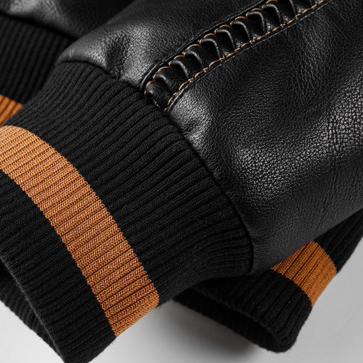 Collar & Cuffs Detail: The collar is designed with a classic ribbed style that rests comfortably around the neckline, while the cuffs mirror this design with ribbed detailing accented by black and tan stripes for an added flair. -