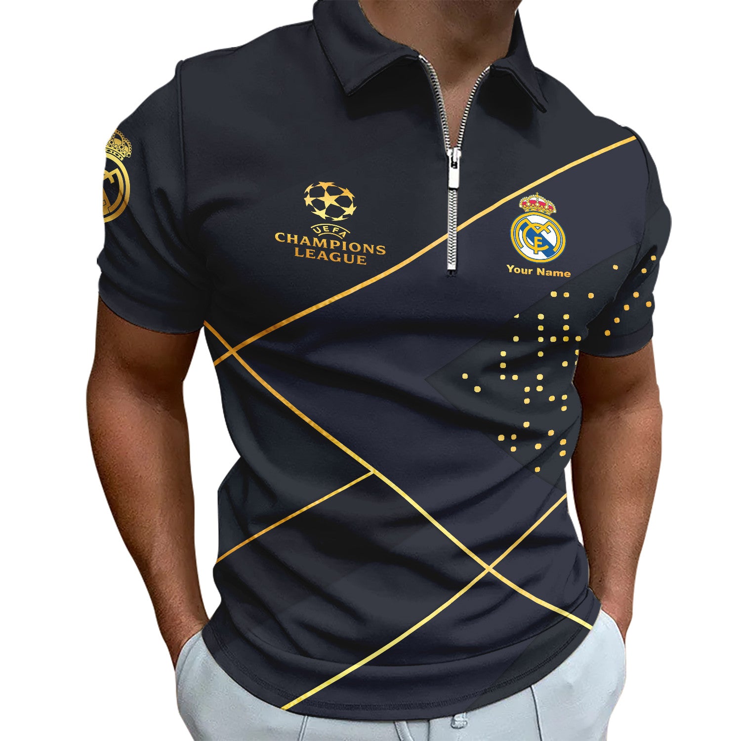 Personalized Real Madrid Luxury 3D Full Printing Set , Real Madrid Shirt , Real Madrid Set , Zipper Polo, Hoodie , Short , Polo , hawaii